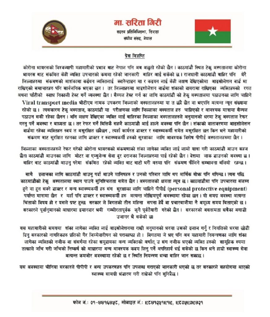 ‘सरकारले पोखरा, नेपालगञ्ज र धरानमा कोरोना भाइरस टेस्ट सेन्टर स्थापना गर्ने निर्णय पनि प्रकाशमा आएको छ। उक्त निर्णय पनि त्रुटिपूर्ण हो,’ गिरीले विज्ञप्तिमार्फत भनेकी छिन्, ‘प्रदेश नं २ को बेवास्ता सरकारले गरेको छ जुन निन्दनीय छ, प्रदेश नं २ सबैभन्दा बढी जनघनत्व भएको र प्रदेशहरुमध्येको सर्वाधिक आर्थिक विपन्न प्रदेश हो, महामारीको समयमा डाक्टर, स्वास्थ्यसेवा सामग्री र दबाई गरीब प्रदेशमा पठाउनु पर्नेमा सरकार प्रदेश नम्बर २ मा सेना परिचालन गरी सरकारी साधन र श्रोतको दुरुपयोग गरी रहेको छ।’