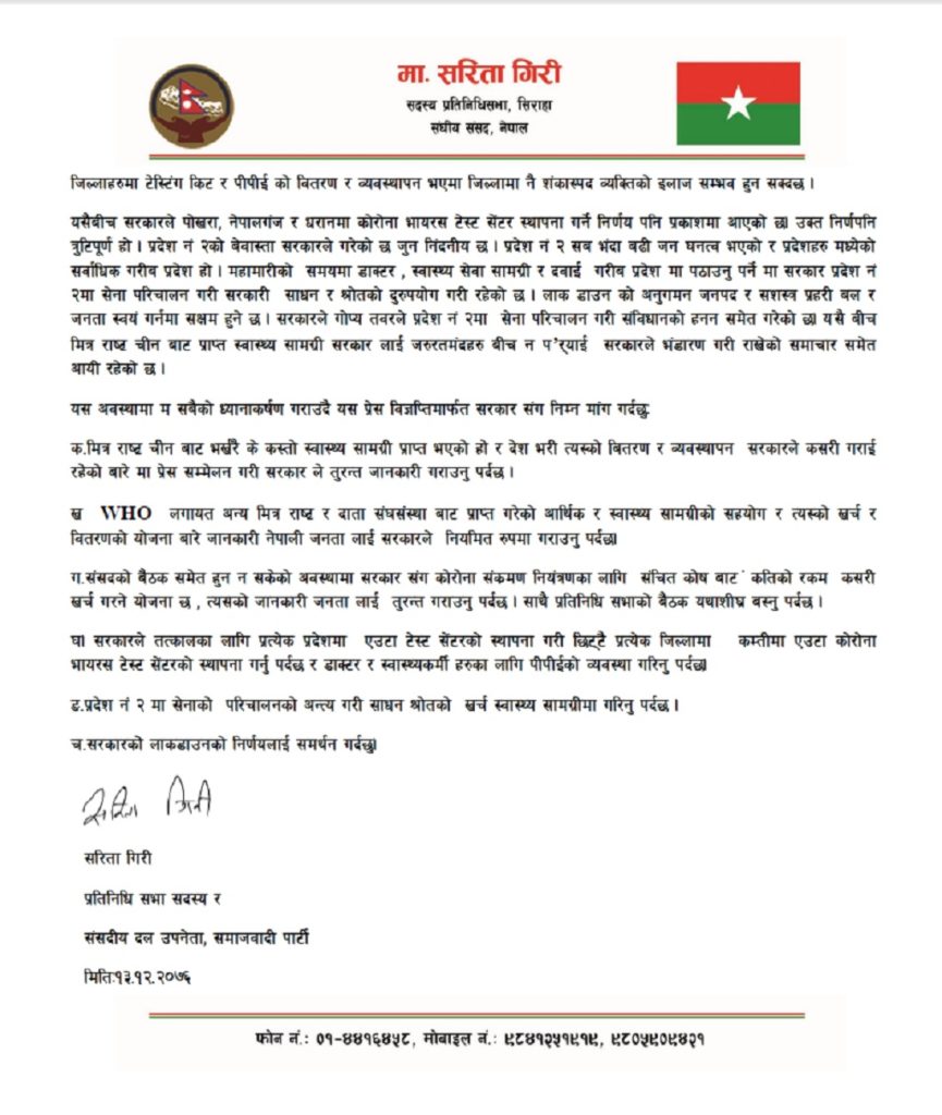 चीनबाट स्वास्थ्य सामग्री प्राप्त भएको विषयमा पनि गिरीले सरकारको जवाफ माग गरेकी छिन्। ‘चीनबाट आएको स्वास्थ्य सामग्री के कस्तो हो, देशभरि त्यसको वितरण र व्यवस्थापन सरकारले कसरी गराइरहेको छ भन्नेबारे सरकारले तुरन्त जानकारी गराउनु पर्छ,’ गिरीले भनेकी छिन्।