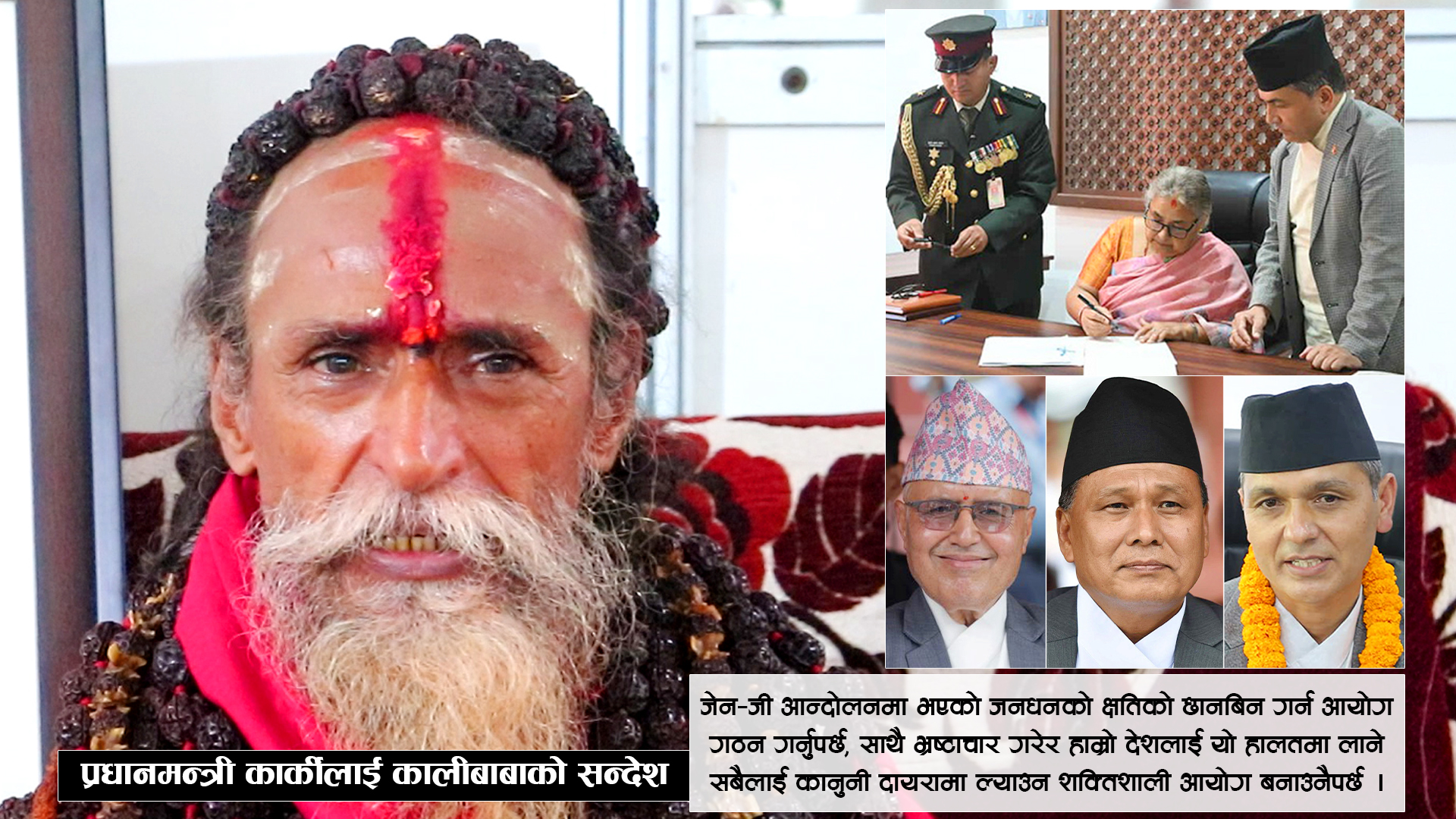 काठमाडौँ, असोज ३ गते । अन्तर्राष्ट्रिय सन्त एवं धार्मिक अभियन्ता कालीबाबा (श्री श्री १००८ महामण्डलेश्वर स्वामी कृष्णनन्द परमहंश बाबा कालीदास) ले जेन–जी आन्दोलनका सन्दर्भमा छानबिन गरी दोषीलाई कारबाही गर्न सरकारसँग आग्रह गरेका छन् । कालीबाबाले