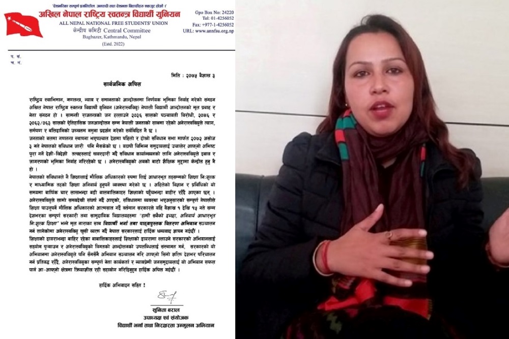 ‘शिक्षाको दायराभन्दा बाहिर रहेका बाबालिकाहरुलाई शिक्षाको दायरामा ल्याउने सरकारको अभियानलाई सहयोग पुर्याउन र अनेरास्ववियुको विगतको आन्दोलनको उपलब्धिलाई संस्थागत गर्न, सरकारको यो अभियानमा अनेरास्ववियुले पनि सँगसँगै अभियान सञ्चालन गरी आफ्नो सिंगो शक्ति देशभर परिचालन गर्न प्रतिवद्ध रहँदै, अनेरास्ववियुका सम्पूर्ण नेता कार्यकर्ता र न्यायप्रेमी जनसमुदायलाई यो अभियान सफल पार्न आ–आफ्नो क्षेत्रमा क्रियाशील रही सहायोग गरिदिनुहुन हार्दिक अपिल गर्दछाैं,’ विज्ञप्तीमा भनिएको छ।