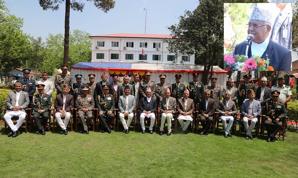 प्रधानमन्त्री ओलीले नेपाली तोपसँग खुकुरीले लडेर जीत हासिल गरेको जाति भएको स्मरण गराए। ‘राष्ट्रिय सुरक्षा र नेपाली सेनालाई भित्रै देखि बलियो बनाउनु पर्दछ,’ ओलीले भने, ‘भित्र कमजोर पार्ने तर बाहिर बलियो देखाएर मात्र हुँदैन।’