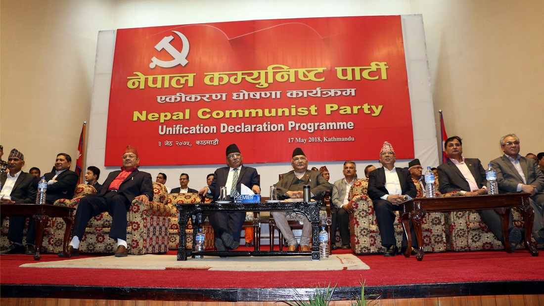 २) पार्टी एकीकरणको गहनतम् कार्यलाई अघि बढाउनको लागि यस बीचमा बनेका विभिन्न कार्यदलहरु र दुबै पार्टीका नेताहरु सम्मिलित आठ सदस्यीय पार्टी एकता संयोजन समितिले साझा घोषणा, सरकारका सुशासन र विकासका प्राथमिकतासम्बन्धी प्रतिवेदन, राजनीतिक प्रतिवेदन र अन्तरीम विधान तयार गर्ने जिम्मेवारी पूरा गरेका छन् । दुवै पार्टीको शीर्ष नेतृत्वले सक्रियता र दृढताका साथ पार्टी एकीकरणका जटिल पक्षहरुलाई समेत सहज तुल्याउँदै आजको अवस्थासम्म आइपुग्न नेतृत्व प्रदान गर्यो । यसरी सहमतिका साथ एकताका सैद्धान्तिक, कार्यक्रमिक, नीतिगत र संगठनात्मक आधार तयार गर्दै आजै नेकपा (एमाले) र नेकपा (माओवादी केन्द्र) को विधिवत् एकीकरण भई निर्वाचन आयोगमा एकतावद्ध नेपाल कम्युनिष्ट पार्टी दर्ता गरेका छौं । युगीन महत्वको यस घोषणाले राजनीतिक स्थायित्व, दीगो शान्ति र समृद्धि कायम गर्ने लामो समय देखिको राष्ट्रको आवश्यकता र जनताको चाहना पूरा भएको छ ।