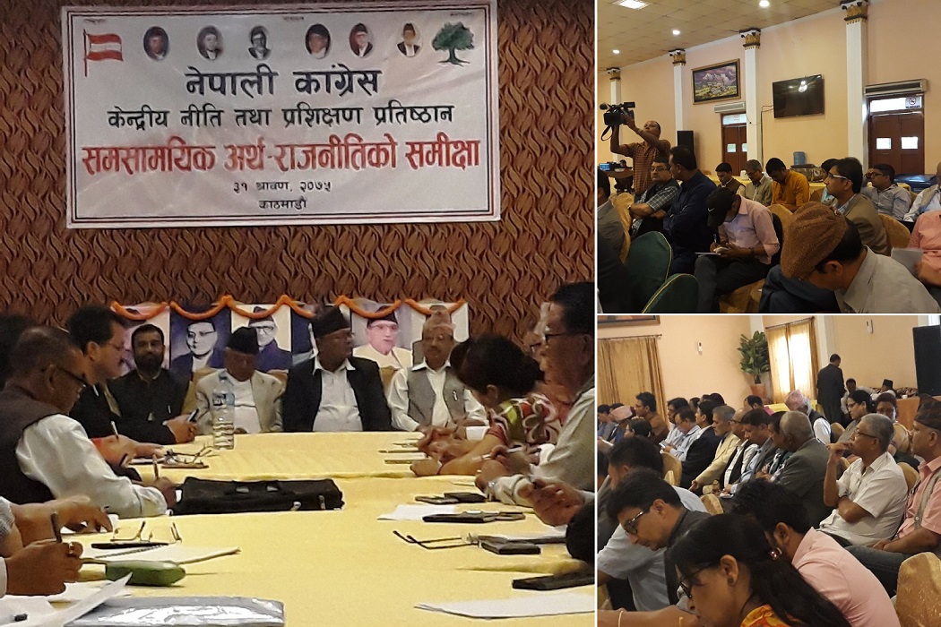 काठमाडौं – नेपाली कांग्रेसको केन्द्रीय नीति तथा प्रशिक्षण प्रतिष्ठानले ‘समसामयिक अर्थ–राजनीतिको समीक्षा’ कार्यक्रम आयोजना गर्यो। काठमाडौंको लैनचौर ब्याङ्केटमा बिहीबार आयोजित कार्यक्रम विभिन्न कारणले विशिष्ट थियो। उद्घाटनसत्र थिएन, न त आसनग्रहण नै भयो। न भाषणको लामो ताँती थियो। सीधा विषयमा प्रवेश गरेर शुरु भएको कार्यक्रममा उपस्थित पनि उत्साहित देखिन्थे। र, उनीहरु भन्दैथिए, ‘नेपाली कांग्रेसले शुरु गरेको यो ट्रेन्ड अरु राजनीतिक दलहरुले पनि अनुशरण गरेहुन्छ।’