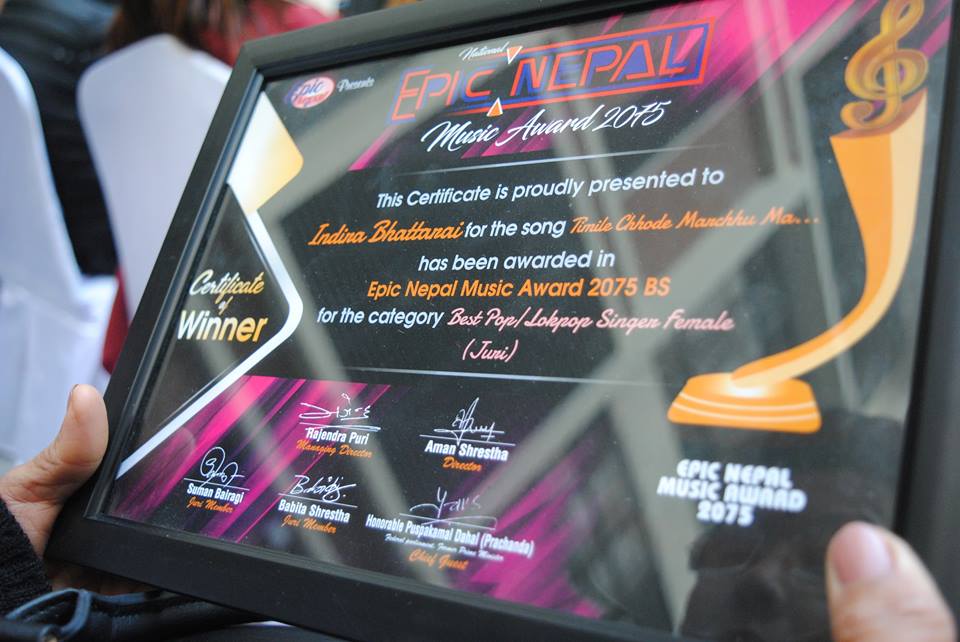 गायिका भट्टराई ‘तिमीले छाडे मर्छु म’ बोलको गीतबाट उत्कृष्ट लोक तथा लोक पप गीत विधामा अवार्ड हात पार्न सफल भएकी हुन्। ‘कला र गलाको संरक्षण हाम्रो अभियान’ भन्ने नारासहित तयार भएको एपिक नेपाल ‘म्युजिक अवार्ड २०७५’ले गायिका भट्टराईको म्युजिक कलालाई अवार्ड हस्तान्तरण गरेको छ।