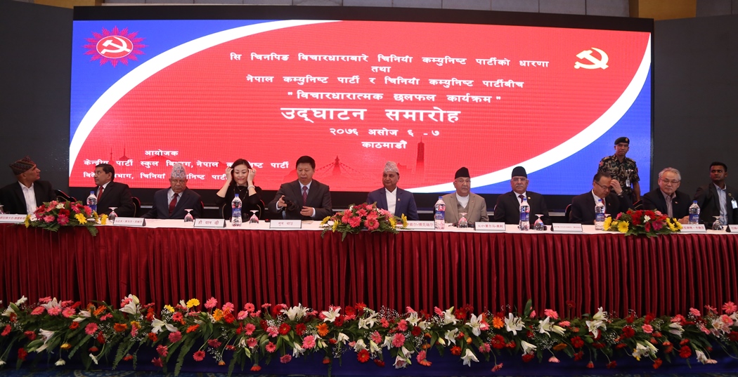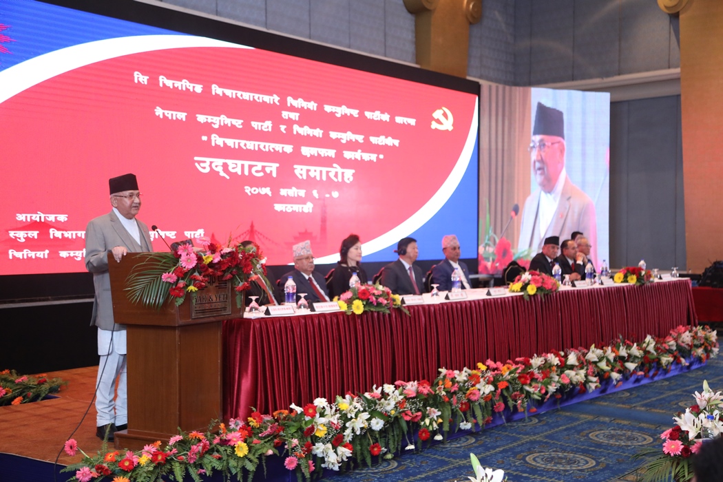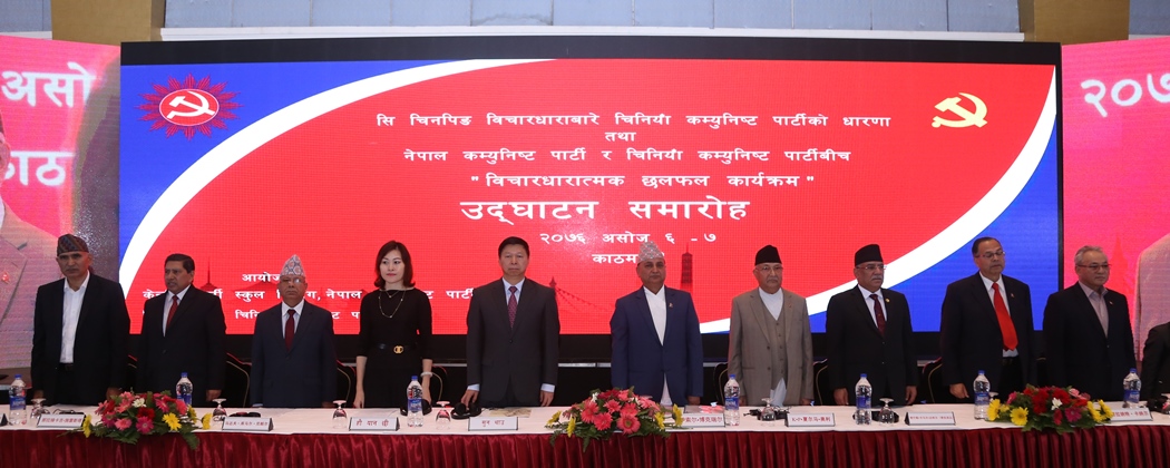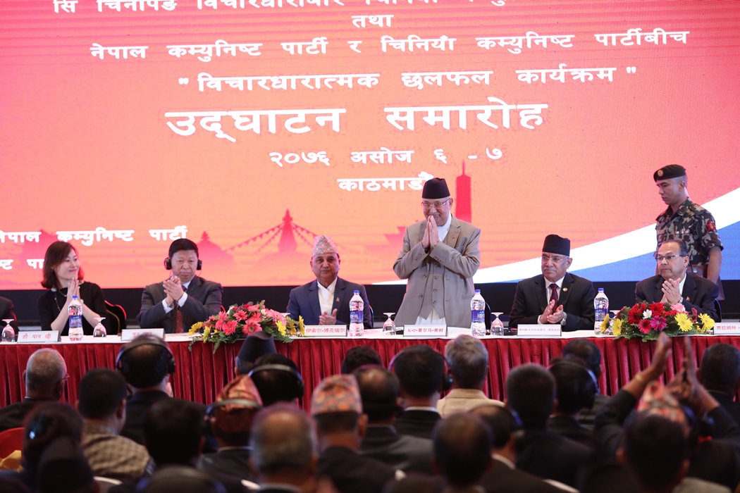 नेकपाको केन्द्रीय स्कुल विभाग र चिनियाँ कम्युनिष्ट पार्टीको अन्तर्राष्ट्रिय विभागले आयोजना गरेको विचारधारात्मक छलफल कार्यक्रमको शुभारम्भका अवसरमा प्रमुख अतिथिका रुपमा सम्बोधन गर्दै प्रधानमन्त्री ओलीले नेपालले राजनीतिक आन्दोलन र परिवर्तनको चरण पार गरी उपलब्धिलाई संस्थागत गर्न अधिकारसम्पन्न नयाँ संविधानको कार्यान्वयन र ‘समृद्ध नेपाल, सुखी नेपाली’को राष्ट्रिय आकाङ्क्षा पूरा गर्नु वर्तमान कार्यभार भएको स्पष्ट गर्नुभयो।