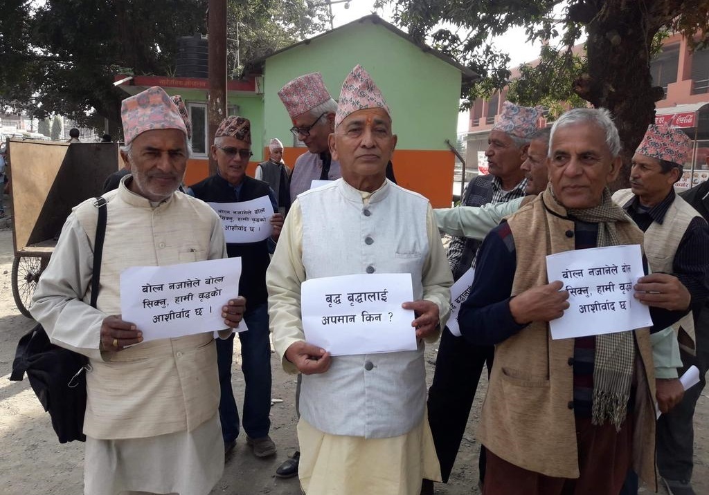 ‘बोल्न नजाने बोल्न सिक्नु हामी बृद्धको आशिर्वाद छ, बृद्धबृद्धाको अपमान किन?’ लगायतका नारा लेखेएका प्लेकार्ड र व्यानरसहित जेष्ठ नागरिकले प्रदर्शन गरेका हुन्।