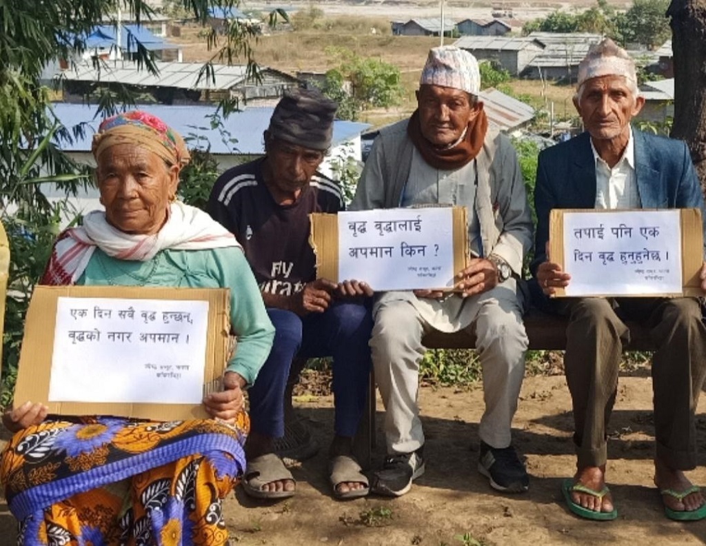 जेष्ठ समूहले काँकरभिट्टामा आयोजना गरेको प्रदर्शनका सहभागीले ‘तपाई पनि एकदिन बृद्ध हुनुहुनेछ, एकदिन सबै बृद्ध हुन्छन्, बृद्धको नगर अपमान’ आदि लेखिएका पोस्टर बोकेका थिए।