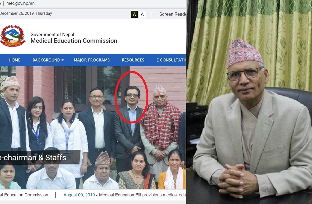 ‘उपाध्यक्ष प्रा.डा. गिरीको नियुक्ति असंगत भएको कुरा पहिल्यै उठेको थियो, अहिले छोरा पियुश गिरीसहितको फोटो आयोगको वेबसाइटमै राख्नु लगाएपछि उहाँप्रति गुनासो बढेको छ,’ आयोगका एक कर्मचारीले भने।
