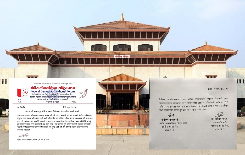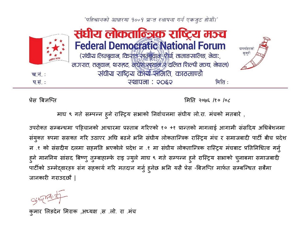 ‘संघीय लोकतान्त्रिक राष्ट्रिय मञ्च र समाजवादी पार्टीबीच प्रदेश नम्बर १ को संसदीय दलमा सहमति भएकाले प्रदेश नम्बर १ मा संघीय लोकतान्त्रिक राष्ट्रिय मञ्चबाट प्रतिनिधित्व गर्नु हुने सांसद विष्णु तुम्बाहाम्फे राईले माघ ९ गते सम्पन्न हुने राष्ट्रिय सभाको चुनावमा समाजवादी पार्टीका उम्मेदवारसँग सहकार्य गरी मतदान गर्नु हुनेछ भनि सम्बन्धित सबैमा जानकारी गराउँछौँ,’ अध्यक्ष लिङदेनले जारी गरेको विज्ञप्तिमा भनिएको छ।