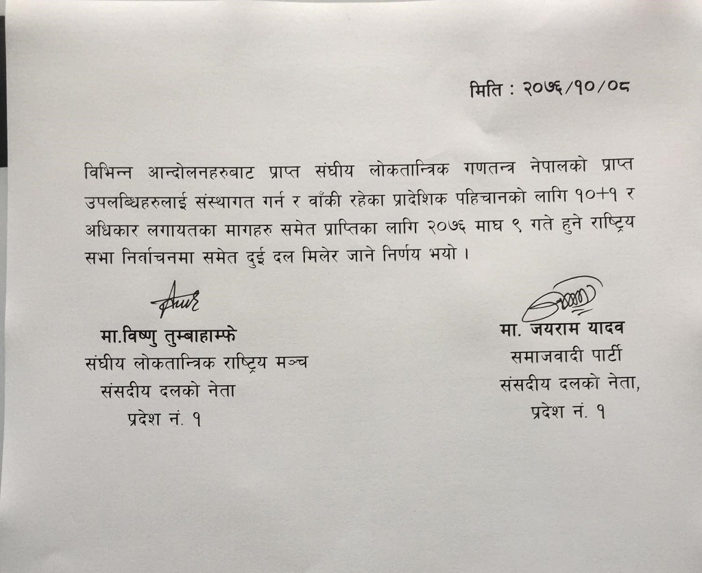 ‘विभिन्न आन्दोलनहरूबाट प्राप्त संघीय लोकतान्त्रिक गणतन्त्र नेपालको प्राप्त उपलब्धिहरूलाई संस्थागत गर्न र बाँकी रहेका प्रादेशिक पहिचानका लागि दश प्लस एक र अधिकार लगायतका मागहरू समेत प्राप्तिका लागि २०७६ माघ ९ गते हुने राष्ट्रियसभा निर्वाचनमा दुई दल मिलेर जाने निर्णय भयो,’ निर्णयमा भनिएको छ।