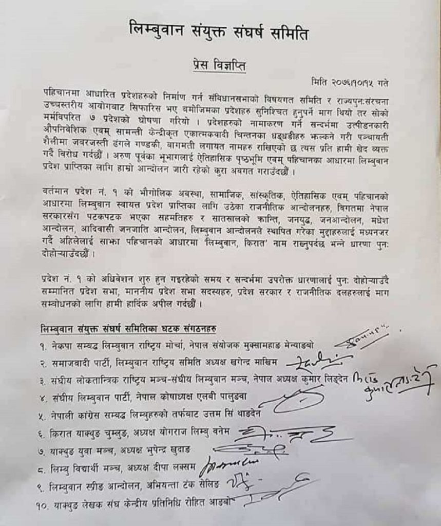 त्यसैगरी, याक्थुङ युवा मञ्चका अध्यक्ष भूपेन्द्र खुदाङ, लिम्बु विद्यार्थी मञ्चकी अध्यक्ष दीपा लक्सम, लिम्बुवान प्रिङ आन्दोलन अभियन्ता टंक सेलिङ र याक्थुङ लेखक संघका केन्द्रीय प्रतिनिधि रोहित आङबोले विज्ञप्तिमा हस्ताक्षर गरेका छन्।