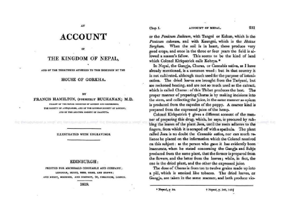 त्यस्तै अर्को दस्तावेज हो, फ्रान्सिस ह्यामिल्टनद्वारा लिखित पुस्तक ‘एन अकाउन्ट अफ द किङ्गन्डम अफ नेपाल’।  सन् १८१९ मा  बेलायतबाट प्रकाशित यो पुस्तकमा नेपालको ऐतिहासिक रूप देखिन्छ। यतिमात्र होइन पुस्तकले त्यतिबेलाको नेपालको सामाजिक तथा आर्थिक स्वरुपको पनि व्याख्या गर्छ। ह्यामिल्टनद्वारा लिखित पुस्तक ‘एन अकाउन्ट अफ द किङ्गन्डम अफ नेपाल’को कभर र एउटा पेज ह्यामिल्टनले नेपालको गाँजा व्यापारको बारेमा पनि व्याख्या गरेका छन्।
