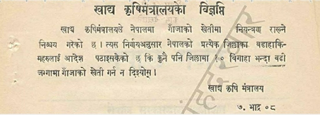 २००८ सालबाट  सरकारले गाँजा कम रोप्न आह्वान गरेको भेटिन्छ। खाद्य तथा कृषि मन्त्रालयले एक विज्ञप्ति जारी गर्दै प्रत्येक जिल्लामा १० विगाहभन्दा बढी जमीनमा गाँजा खेती गर्न नदिन आह्वान गरेको थियो। ‘खाद्य तथा कृषि मन्त्रालयले नेपालको गाँजा खेतीमा नियन्त्रण गर्ने निश्चय गरेको छ, त्यसअनुसार नेपालका प्रत्येक जिल्लाका बडाहाकिमलाई आदेश पठाइसकेको छ कि कुनै पनि जिल्लामा १० विगाह भन्दा बढी जग्गामा गाँजाको खेती गर्न नदिइयोस्’, विज्ञप्तिमा भनिएको छ।