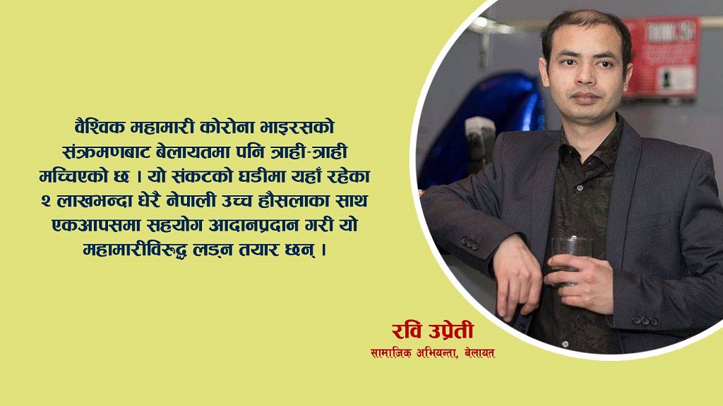 वैश्विक महामारीको रुपमा फैलिएको कोरोना भाइरसको संक्रमणबाट बेलायतमा पनि अछुतो रहेन। बेलायत सरकारको उच्च सुरक्षा सतर्कता र निगरानीका बावजुद यहाँको निकै ठूलो जनसंख्या कोरोना भाइरसबाट संक्रमित भइसकेको छ। बेलायतमा स्थायी र अस्थायी बसोबास गर्ने २ लाखभन्दा धेरै नेपाली समुदाय पनि कोरोना भाइरसको त्रासबाट आक्रान्त छ। नेपालीहरूमा खासै संक्रमण नदेखिए पनि त्रासको माहोल हरेकजसोको अनुहारमा देखिएको छ।