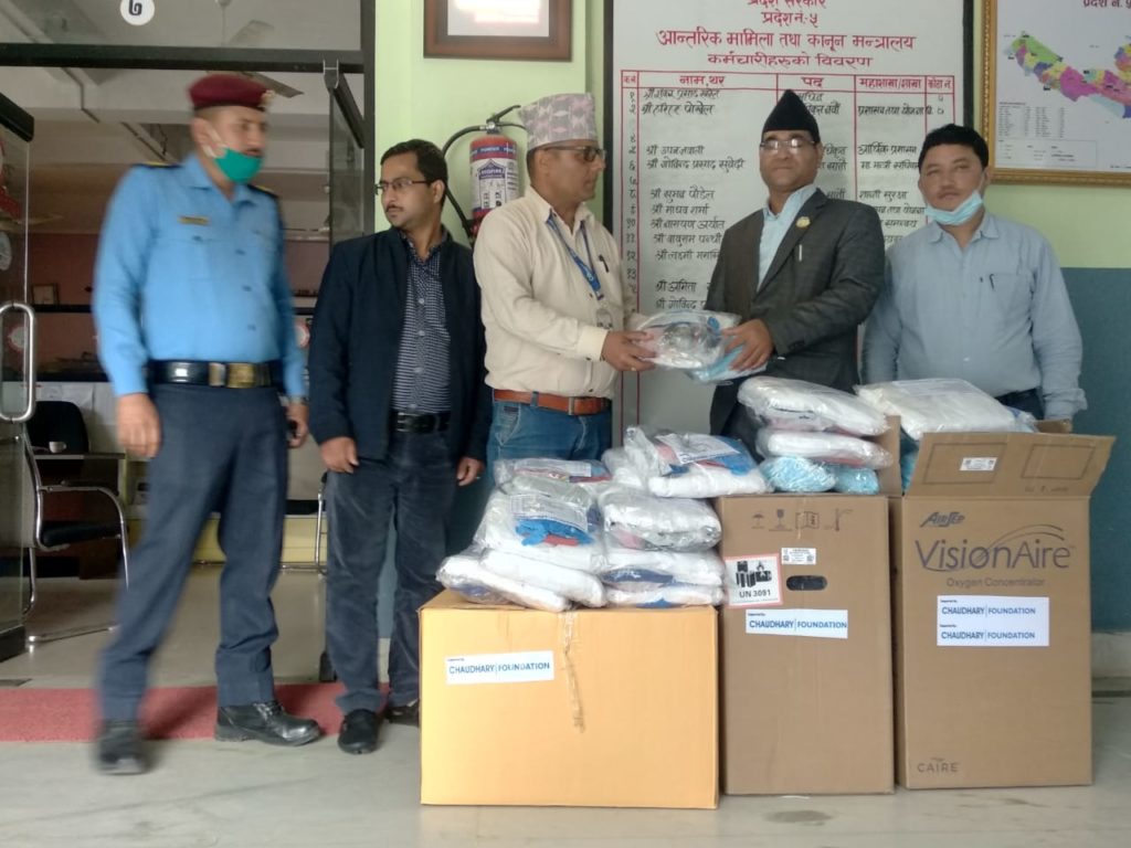 चौधरी फाउन्डेशनले बागमती प्रदेशका कान्ति बाल अस्पताल काठमाडौं, त्रिवि शिक्षण अस्पताल काठमाडौं, वीर अस्पताल काठमाडौं, शुक्रराज ट्रपिकल तथा सरूवा रोग अस्पताल, टेकु काठमाडौं, मनमोहन कार्डियोथोरासिक भास्कुलर तथा ट्रान्सप्लान्ट सेन्टर, काठमाडौं, पाटन स्वास्थ्य विज्ञान प्रतिष्ठान ललितपुर सुरक्षा सामग्री वितरण गरेको छ।