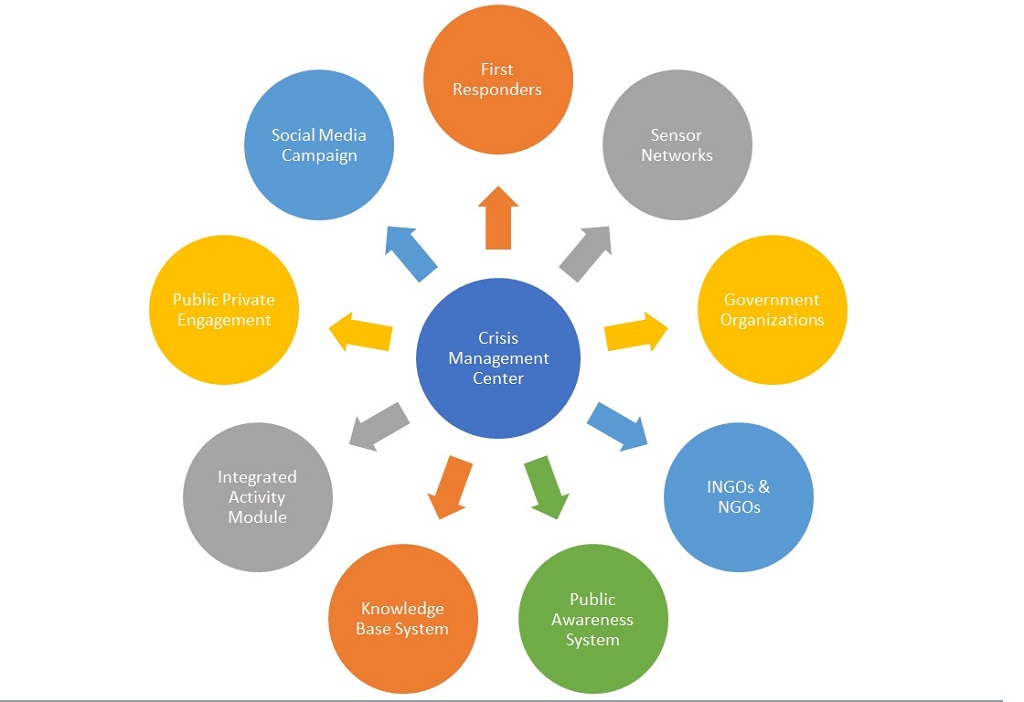 The figure presented below shows the integrated framework for crisis management. This framework provides the complete integration of the governmental, semi-governmental, development partners and citizen engagement to strengthening emergency preparedness in countries and communities.