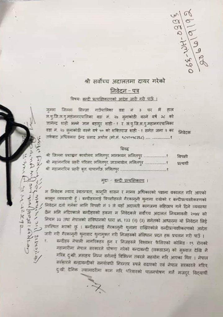 वरिष्ठ अधिवक्ता तथा मानवअधिकारवादी इन्द्रप्रसाद अर्यालले शुक्रबार सर्वोच्च अदालतमा बन्दीप्रत्यक्षीकरण रिट निवेदन दायर गरेका हुन्।