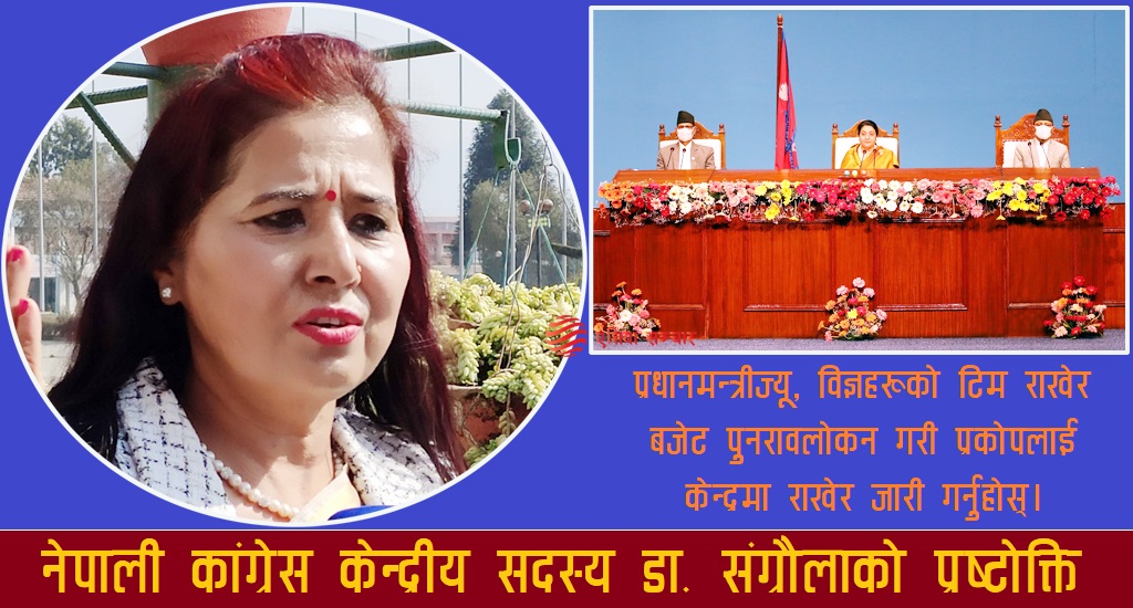 विज्ञहरूको टिम राखेर बजेट पुनरावलोकन गर्न प्रधानमन्त्री केपी ओलीलाई सुझाव दिँदै नेतृ संग्रौलाले बजेटले कोरोना प्रकोपलाई गम्भीर ढंगले सम्बोधन गर्नुपर्ने बताएकी छिन्।