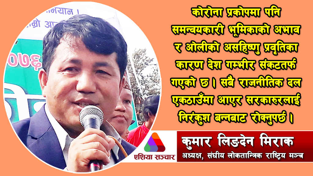काठमाडौं, ९ भदौ – संघीय लोकतान्त्रिक राष्ट्रिय मञ्चका केन्द्रीय अध्यक्ष कुमार लिङदेन मिराकले कोरोना प्रकोप नियन्त्रणमा सरकार पूर्णतः असफल भएको बताएका छन्।