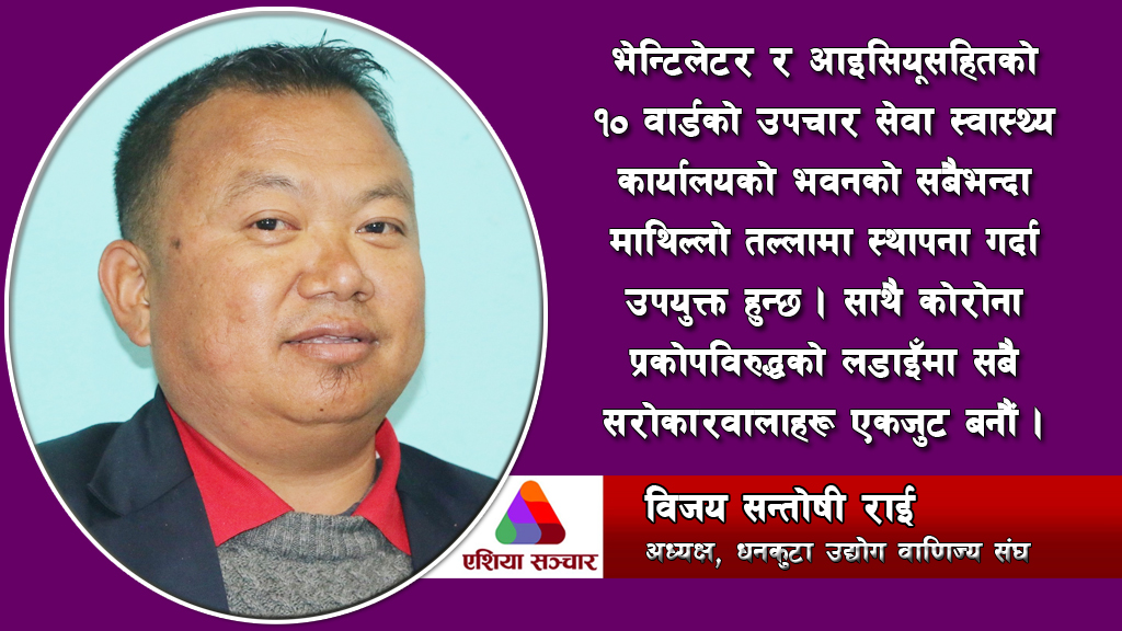 धनकुटा, १६ भदौ – धनकुटा उद्योग वाणिज्य संघका अध्यक्ष विजय सन्तोषी राईले आइसियू, भेन्टिलेटरसहितको १० वार्डको उपचार सेवा स्वास्थ्य कार्यालयको भवनको सबैभन्दा माथिल्लो तल्लामा स्थापना गर्दा उपयुक्त हुने सुझाव दिएका छन्।