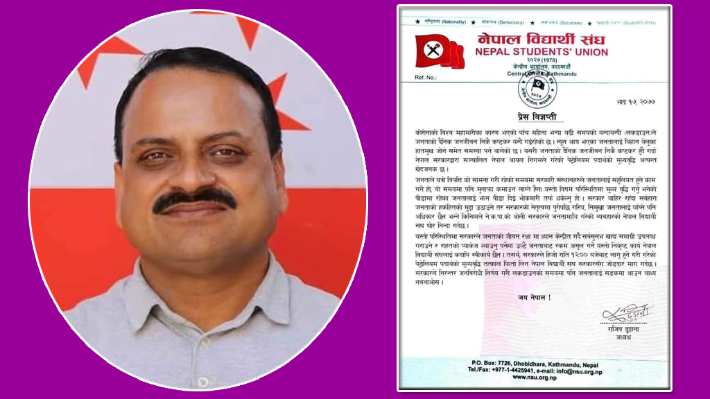 नेपाल विद्यार्थी संघका केन्द्रीय अध्यक्ष राजीव ढुंगानाले विज्ञप्ति जारी गरी पेट्रोलियम पदार्थको मूल्यवृद्धि तत्काल फिर्ता गर्न माग गरेका हुन्।
