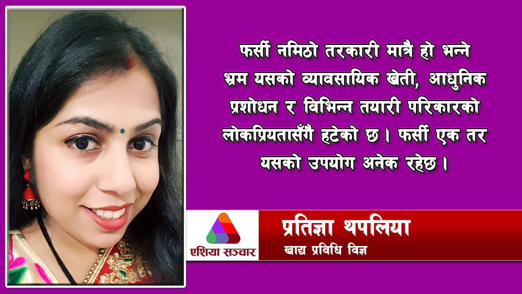 फर्सी एउटा नमिठो तरकारी मात्रै हो भन्ने मेरो भ्रम । यसको व्यावसायिक खेती, आधुनिक प्रशोधन, र विभिन्न तयारी परिकारको लोकप्रियतासँगै हटेको छ । फर्सी एक तर यसको उपयोग अनेक रहेछ । उदाहरणका लागि पाकेको फर्सीको लिटो, बट्टामा प्याक भएर बेबी फुडको रुपमा बजारमा उपलब्ध छ । बेकरी आइटमहरूमा यसको व्यापक प्रयोग हुन्छ पमकिन पाई, बार्स, चीज केक ईत्यादी धेरै लोकप्रिय परिकार रहेछन् । कफी, कुकिज ईत्यादिमा पमकिन स्पाइस फ्लेवरको छुट्टै महत्व रहेको पाइन्छ ।
