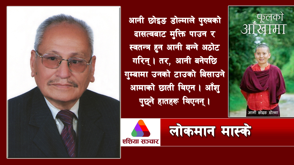 आनी छोइङ डोल्माको फूलको आँखामा नाम राखिएको जीवन कथा अठार परिच्छेद र उपपरिच्छेदहरू जोड्दा उन्नाइस परिच्छेदमा बाँडिएको छ। यो सबै परिच्छेदहरू ‘एक से एक’का छन्। कुनैमा त उनको सम्प्रेषण, शैली सारै मर्मस्पर्शी छन्। यस्तै लाग्छ, हामीसँगै बसेर उनीले जीवन कथा भनि रहेकी छिन्। उनले भनिरहेका कुराहरू सजीव लाग्छन्। उनको जीवन कथा खोलाको पानी बगेझैं सलल बगेको छ। नेपाली दाजुभाई दिदीबहिनीका लागि फूलको आँखामा फूलको संसार गतिलो कोशेली दिएकी छिन्। उनले बाबुको कुटाई र गुरुको कृपाले ‘आनी’ बनाइदिएको स्वीकार गर्छिन्। त्यस्तो नभई दिएको भए अन्य धेरै भोटिया महिला जस्तै आत्मसमर्पण गरेकी सानी जस्तै प्रत्येक दिन, बिहान भात पकाउनमा, लुगा धुनमा र रात लोग्नेलाई सन्तुष्ट पार्नमा बित्ने गर्छ। यो भोटिया महिलाको मात्र होइन आधिकांश घर गृहणीको जिउँदोजल्दो तस्वीर हो। तर, उस्को संकल्प र हठताले पुरुष कामनालाई पखेटा लाग्ने बाटो देखाइदिनाले कुनै पसलेकी पत्नी बन्नबाट रोकी आनी बनिन्छ। र, उनीमा प्रेम र कुरुपको हतियारले युद्धरत रहेकी छिन्।