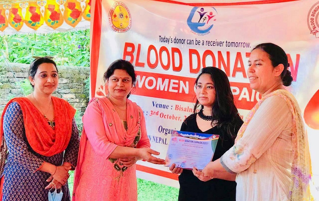 काठमाडौंको विशालनगरमा आयोजना गरिएका रक्तदान कार्यक्रममा २६ जनाले रक्तदान गरेका छन्। केयर फाउण्डेशनले महिलाहरूलाई रक्तदान गर्न अभिप्रेरित गर्ने उद्देश्यले रक्तदानको आयोजना गरेको हो।