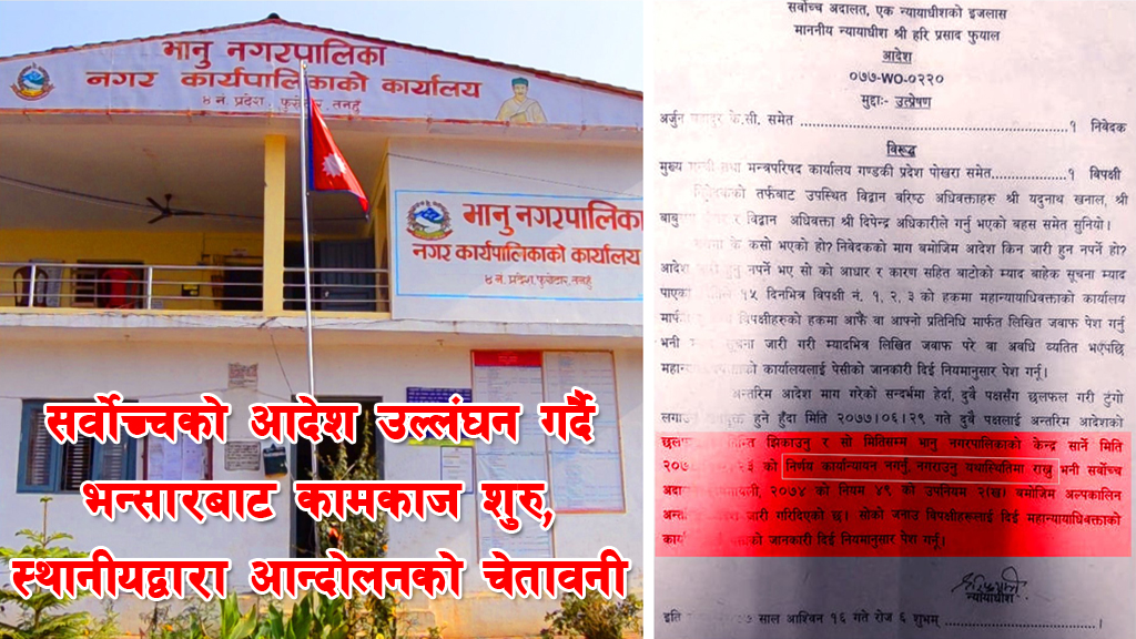 काठमाडौं, २१ असोज – तनहुँ जिल्लास्थित भानु नगरपालिकाको कार्यालय हाल कायम रहेको स्थानबाट अन्यत्र सार्न भइरहेको चलखेलविरुद्ध सर्वोच्च अदालतले तत्काल नसार्न अन्तरिम आदेश दिएको छ।