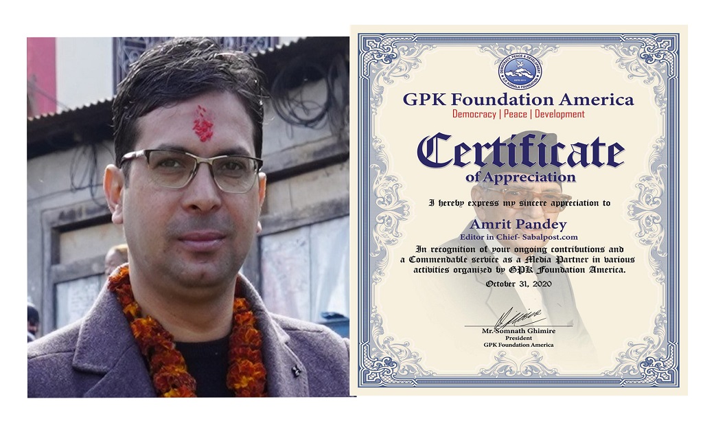 काठमाडौं, २० कात्तिक – जिपी कोइराला फाउण्डेशन अमेरिकाले नेपाली पत्रकारहरूलाई सम्मान गरेको छ। कोरोना भाइरसको महामारीका बेला प्रवासमा रहेका नेपालीहरूको समस्या र मुद्दाहरूमा सक्रियतापूर्वक कलम चलाए वापत फाउण्डेशनले नेपाली पत्रकारहरूलाई सम्मान गरेको छ।