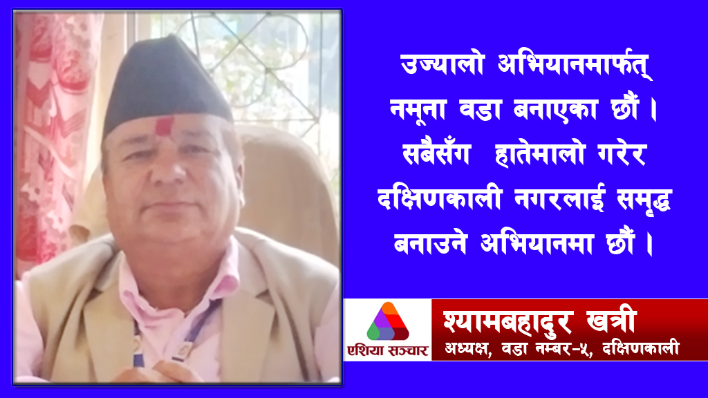 –दक्षिणकाली नगरपालिका वडा नम्बर–५ यस नगरको मुटु नै हो । यस वडामा पानीको मुलको रुपमा पर्याप्त भएको ठाउँ भए पनि यहाँका जनताले खानेपानीको समस्या झेल्नु परिरहेको थियो । हामी निर्वाचित भएर आएपछि नगरको विकासका लागि विकासको ठूलो हिस्सा खानेपानीमा लगानी ग¥यौं । अहिले हामीले खानेपानी जनताका घरघरमा पुर्‍याउन सफल भएका छौं । विकास गतिविधिलाई तीव्र रुपमा अगाडि बढाइरहेका छ । आउँदो माघ महिनासम्ममा वडाका प्रत्येक घरमा पानी पु¥याउने योजना बमोजिम काम भइरहेको छ । नगरपालिकाको मुटुमा रहेको वडा भएको हुनाले यस वडाका स्थानीय जनता, बुद्धिजीवी, सरोकारवाला निकायको सहयोगमा यस क्षेत्रको विकासमा हातेमालो गरेर काम गरिरहेका छौं ।