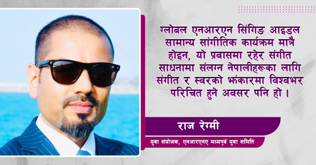 एनआरएनए मध्यपूर्व युवा समिति संयोजक राज रेग्मी अहोरात्र खटिएका छन् ग्लोबल सिंगिङ आइडलको तयारीमा। पहिलो संस्करणमा सहभागी हुनका लागि डिजिटल अडिसन पठाउने मिति ३० अप्रिलसम्म बढाइएपछि यसको तयारी अझै विशिष्ट ढंगबाट चलिरहेको रेग्मीले बताए।