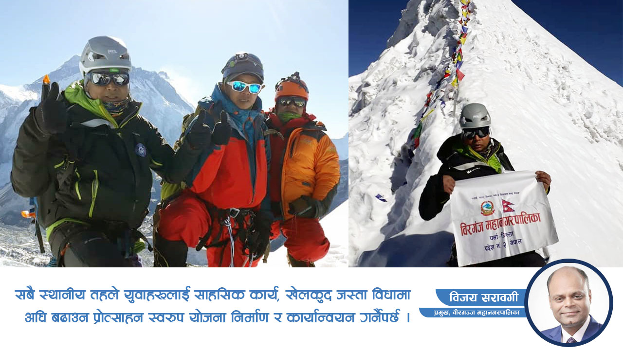 विश्वको सर्वोच्च शिखर सगरमाथामा वीरगञ्ज महानगरको ब्यानर फहराउँदा एकदमै हर्षित महसुस गरेको छु,’ सरावगीले भने।