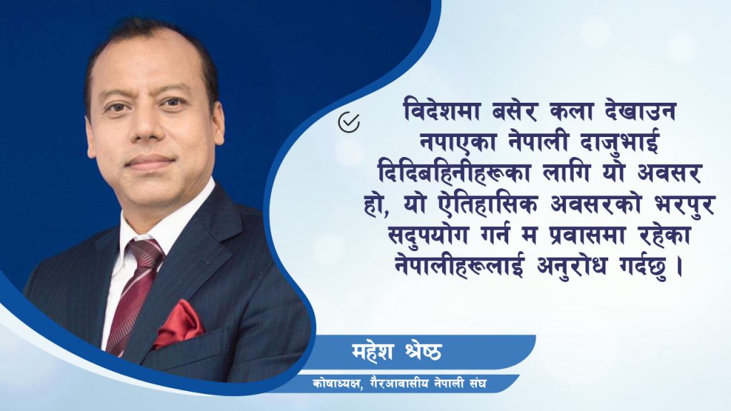गैरआवासीय नेपाली संघ एनआरएनए मध्यपूर्व युवा विभागले आयोजना गरेको ग्लोबल एनआरएन सिंगिङ आइडलका सन्दर्भमा आयोजित छलफललाई सम्बोधन गर्दै श्रेष्ठले प्रतिभा भएर पनि अवसर नभएका प्रवासी नेपालीका लागि यो ठूलो अवसर भएको बताएका हुन्।