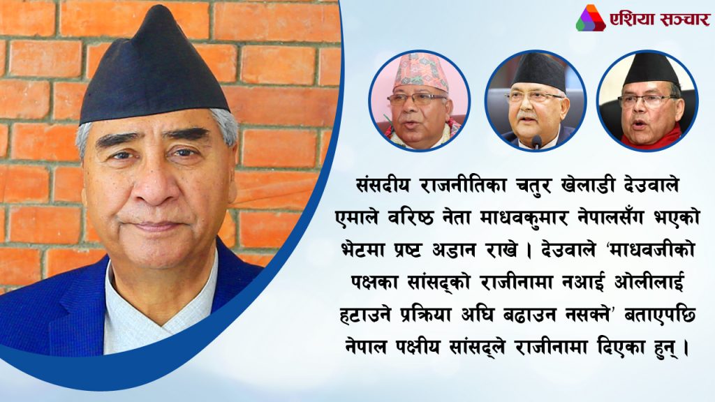 संसदीय राजनीतिका चतुर खेलाडी देउवाले गतसाता एमाले वरिष्ठ नेता माधवकुमार नेपालसँग भएको भेटमा प्रष्ट अडान राखे। ‘माधवकुमार नेपालजीको पक्षमा रहेका सांसद्को राजीनामा नआई ओलीलाई हटाउने प्रक्रिया अघि बढाउन नसक्ने’ देउवाको अडानपछि नै नेपाल पक्षीय सांसद्ले राजीनामा दिएका हुन्।