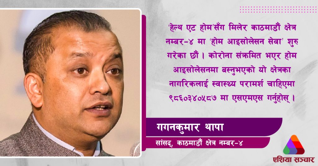 नेपाली कांग्रेसका नेता तथा काठमाडौं क्षेत्र नम्बर–४ का प्रतिनिधिसभा सदस्य (सांसद्) गगनकुमार थापाले कोरोना प्रकोपलाई दृष्टिगत गर्दै ‘होम आइसोलेसन सेवा’ शुरु गरेका छन्। होम आइसोलेसनमा बसेका व्यक्तिले कुनै स्वास्थ्यसम्बन्धी परामर्श लिन चाहेमा मोबाइल नम्बर ९८६०३४०५८७ मा एसएमएस गर्न थापाले अनुरोध गरेका छन्। आइतबारबाट शुरु भएको ‘होम आइसोलेशन सेवा’ के हो? कस्तो हो? यो सेवा क–कसलाई उपलब्ध हुन्छ? र, अबको योजना के छ भन्ने सन्दर्भमा एशिया सञ्चारले नेता थापासँग गरेको कुराकानीः