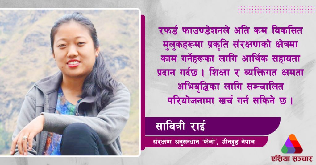 ‘रफर्ड फाउण्डेशनले अति कम विकसित मुलुकहरूमा प्रकृति संरक्षणको क्षेत्रमा काम गर्नेहरूका लागि आर्थिक सहायता प्रदान गर्दछ, शिक्षा र व्यक्तिगत क्षमता अभिबृद्धिका लागि सञ्चालित परियोजनामा खर्च गर्न सकिने छ,’ सावित्रीले भनिन्।