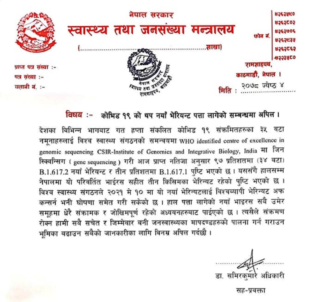 मन्त्रालयका सहप्रवक्ता डा. समीरकुमार अधिकारीले योसँगै नेपालमा अहिलेसम्म कोरोनाका तीन किसिमको भेटियन्ट पुष्टि भएको जानकारी गराएका हुन्।