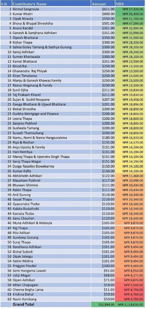 ‘पाँचथर समाज अष्ट्रेलियाका अध्यक्ष कुमार खत्री, उपाध्यक्ष दीपक निरौला, सचिव सुमन खतिवडा र अष्ट्रेलियामा सञ्चालित अभियानका आइटी संयोजक दीपेश भट्टराईमार्फत् समाजका सम्पूर्ण पदाधिकारी एवं कार्यसमिति सदस्यहरू लगायत समाजमा आबद्ध समस्त पाँचथरबासी मान्यजनहरू तथा उहाँहरूका नेपालमा रहनु भएका अभिभावक मान्यजनहरूमा समेत अन्तरमनबाट आभार एवं कृतज्ञता ब्यक्त गर्दछौं,’ निरौलाले भने।