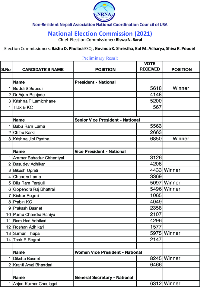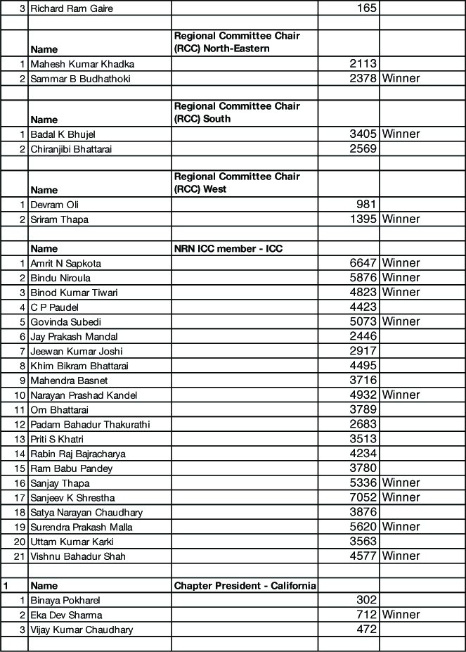 एनआरएनए अमेरिकाको निर्वाचनमा १५ हजार ७ सय ६८ भोट खसेको छ। कुल मत २० हजार १ सय ३८ रहेको थियो।