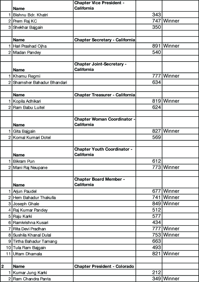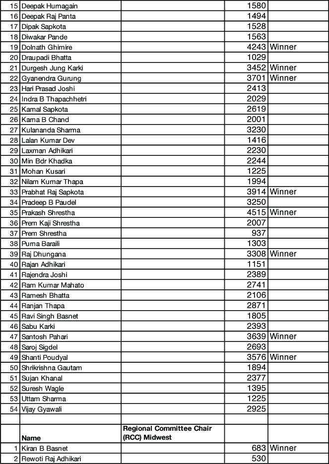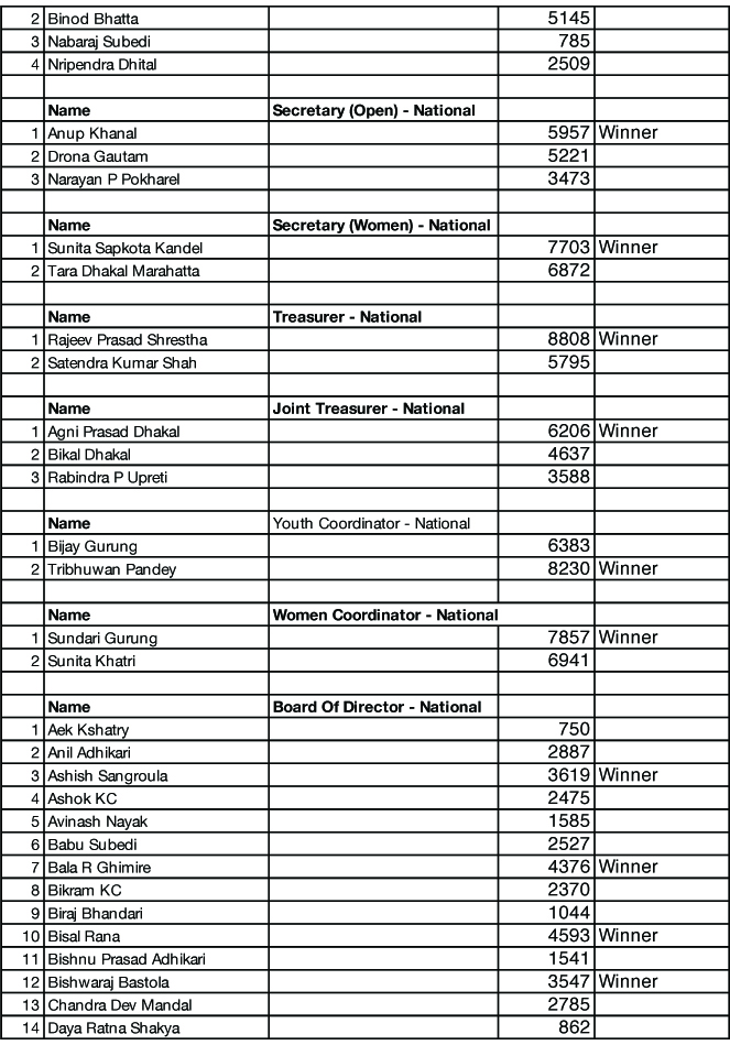 महासचिवमा अञ्जनकुमार चौलागाई, सचिवमा अनुप खनाल, महिलातर्फ सचिवमा सुनिता कँडेल (महिला तर्फ), कोषाध्यक्षमा राजीव श्रेष्ठ तथा सहकोषाध्यक्षमा अग्नि ढकाल विजयी भएका छन्।