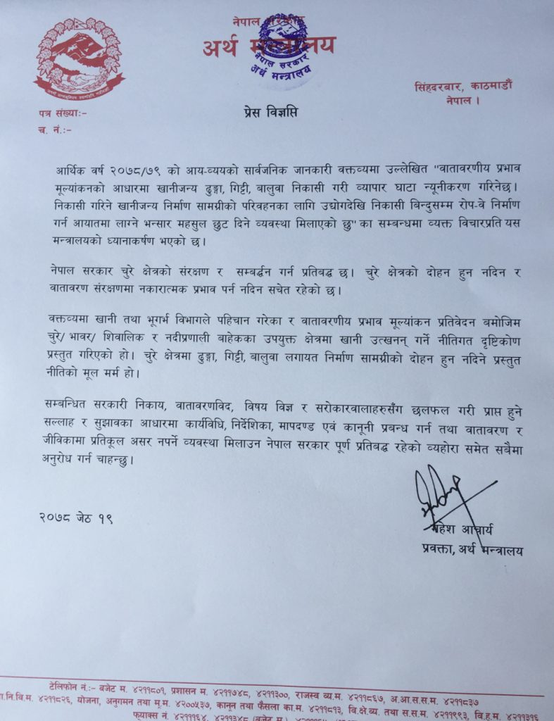 चुरेको विषयमा आलोचना शुरु भएपछि अर्थ मन्त्रालयले विज्ञप्ति जारी गरेको हो। साथै मन्त्रालयले चुरे क्षेत्रको संरक्षणका लागि कुनै पनि कसर बाँकी नराखिने स्पष्ट पारेको छ।
