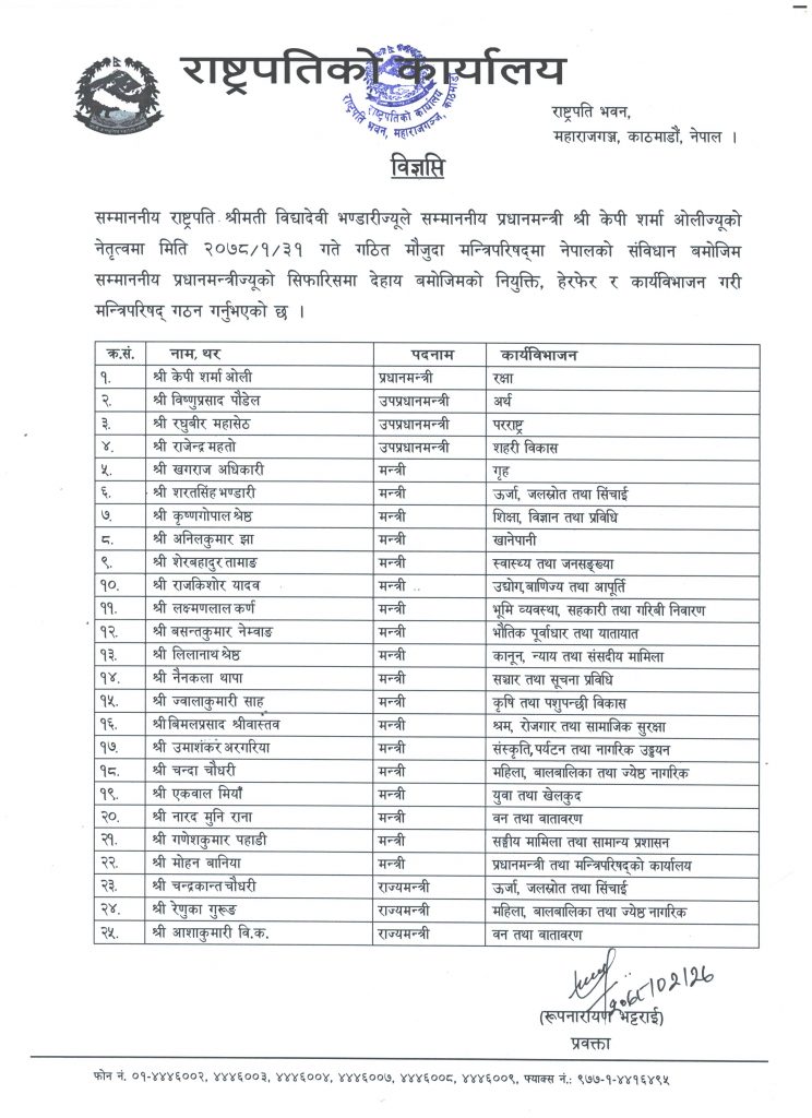 राष्ट्रपति विद्यादेवी भण्डारीले ओलीको गत वैशाख ३१ गठित मौजुदा मन्त्रिपरिषदमै नयाँ नियुक्ति, हेरफेर र कार्यविभाजन मन्त्रिपरिषद् विस्तार गरेको राष्ट्रपति कार्यालयले बिहीबार जारी गरेको विज्ञप्तिमा उल्लेख गरिएको छ।