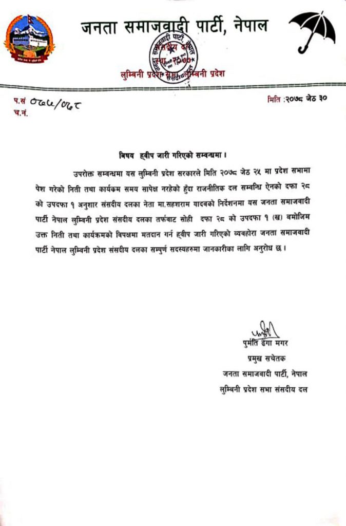 बुटवल, ३० जेठ – जनता समाजवादी पार्टी लुम्बिनी प्रदेश संसदीय दलले प्रदेश सरकारले पेश गरेको नीति तथा कार्यक्रमको विपक्षमा मतदान गर्न आफ्ना सांसदहरूलाई ह्वीप जारी गरेको छ।