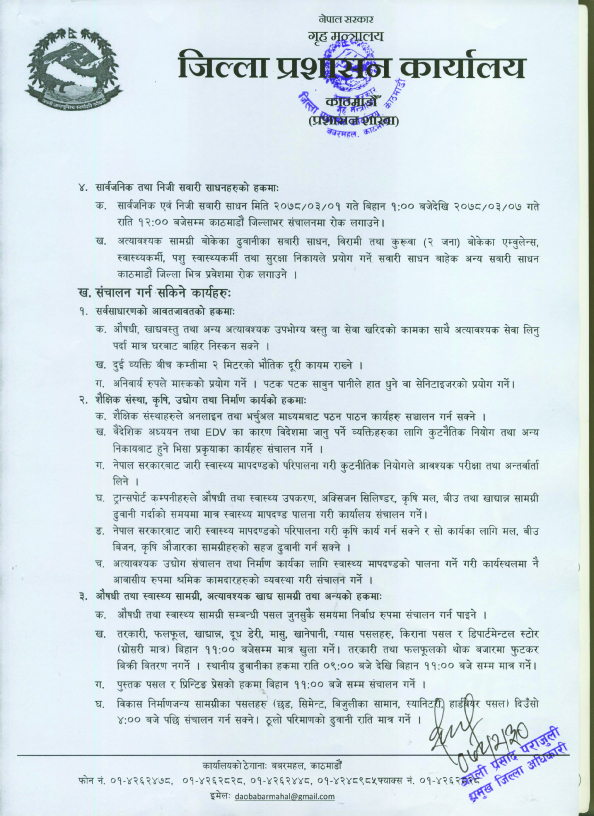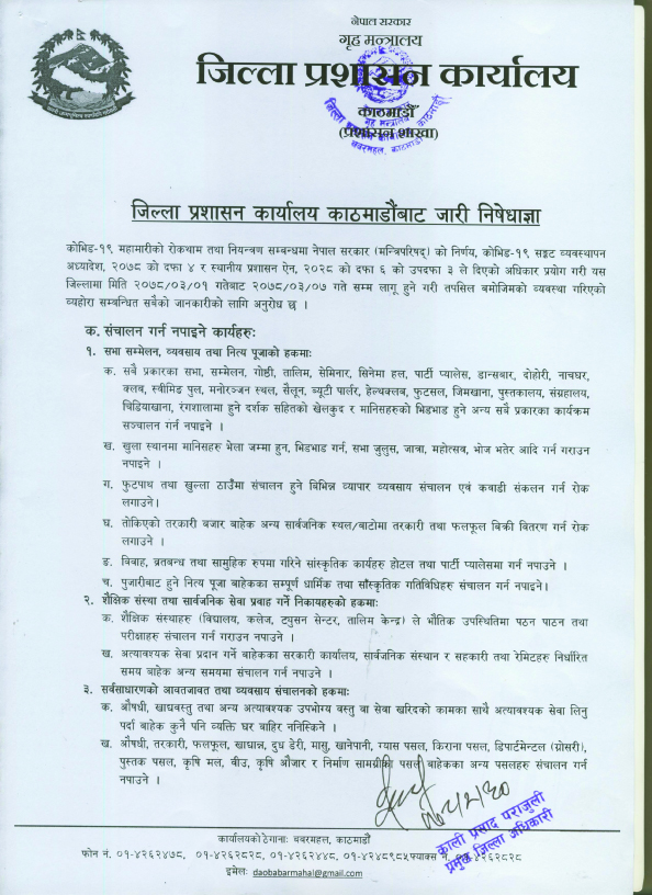कोरोना भाइरसको दोस्रो लहर शुरु भएपछि काठमाडौं उपत्यकाका तीन जिल्लासहित देशैभर निषेधाज्ञा जारी गरिएको छ।