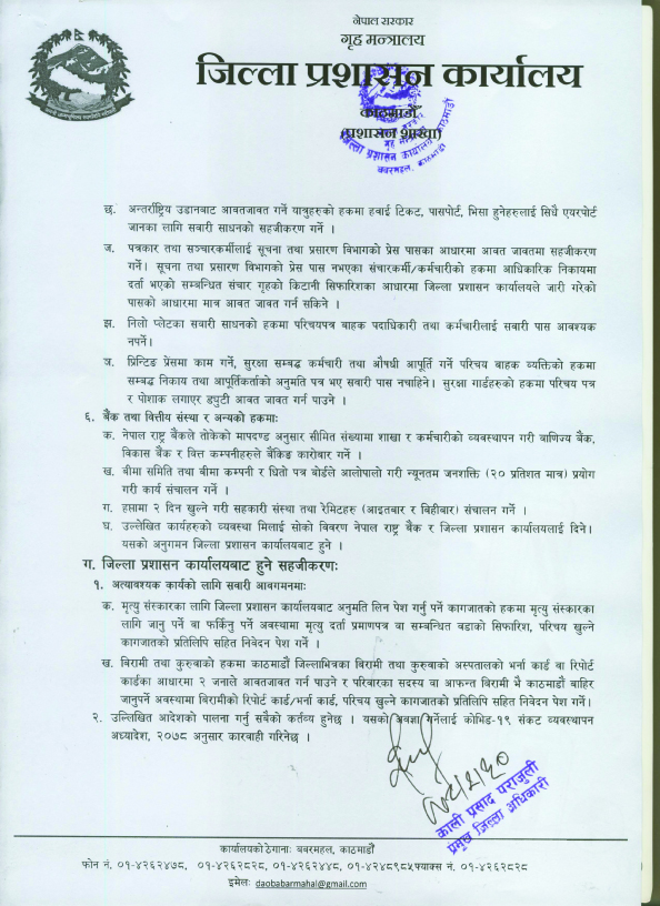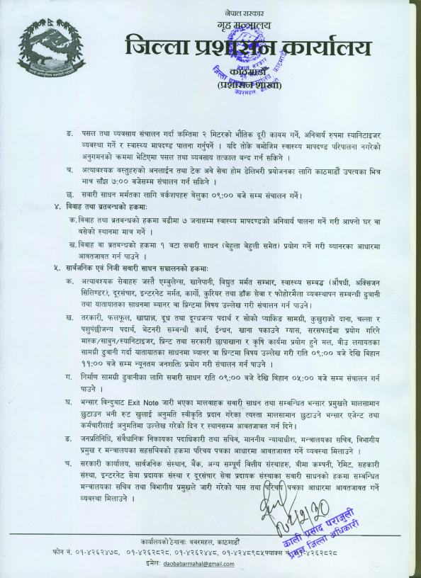 त्यस्तै, अनलाइन डेलिभरी गर्न दिने, पुस्तक पसल बिहान ११ बजेसम्म खोल्न पाइने, हार्डवेयर पसल अपरान्ह ४ बजेपछि खोल्न पाइने र कृषि कार्य सञ्चालन गर्न दिने तथा भिसा लिनका लागि सहजिकरण गर्ने निर्णय भएको एक अधिकारीले जानकारी दिएका छन्।