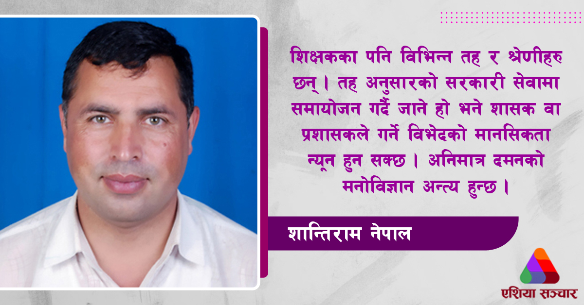 व्यवहारिक रुपमा हेर्ने हो भने एक शिक्षकले कसैलाई काखापाखा गर्दैन । कुनै पनि विद्यार्थी कमजोर होस् त्यो शिक्षक चाहँदैन । सर्काएर होस् वा थर्काएर होस् सबै विद्यार्थीलाई सक्षम, दक्ष र प्रतिभावान बनाउन सकियोस् भन्ने शिक्षकले चाहेको हुन्छ । सिकाइ उपलब्धि राम्रो आओस् भन्ने चाहना हरेक शिक्षकमा हुन्छ । शिक्षकको केन्द्रविन्दुमा विद्यार्थी नै हुन्छन् । आजका शिक्षकका साथमा हिजोका जस्ता इमान्दार विद्यार्थीहरु छैनन् । हिजोका विद्यार्थीले शिक्षकलाई गर्ने व्यवहार र आजका विद्यार्थीले शिक्षकलाई गर्ने व्यवहारका बीचमा आकाश पातालको फरक छ । हिजो त्यही विद्यार्थी शिक्षकलाई उच्च आदरका साथ हेर्दथ्यो तर आज उही विद्यार्थीले शिक्षकलाई साथीको रुपमा हेर्न थालिसकेको छ । भिन्न भिन्न हेराइका बीचमा शिक्षकको वास्तविकता फरक छ । शिक्षकले उत्पादन गरेको विद्यार्थी नेतृत्वमा पुग्यो भने वा प्रशासनिक निकायमा पुग्यो भने शिक्षक आफ्नो उत्पादनमा गर्व गर्छ तर त्यही विद्यार्थी उक्त शिक्षकका लागि शासक वा प्रशासक हुँ भन्ने दम्भ गर्छ । माध्यमिक तहको प्रथम श्रेणीको शिक्षक जसको पदीय हैसियत सह सचिव सरह हुन्छ, उसले निजामतिको खरिदारसँग झुक्नुपर्ने स्थिति कसरी सिर्जना भयो रु यो विभेदको मानसिकता राज्यले सिर्जना गरेको हो ।