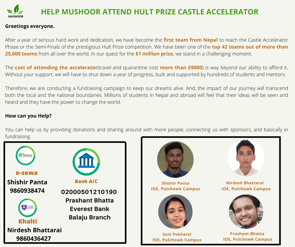 मशूर नाम दिइएको यो प्रविधि काठमाडौंमा आयोजित ‘काठमाण्डू इम्प्याक्ट समिट’ प्रतियोगितामा प्रथम स्थान हासिल गरेपछि अन्तर्राष्ट्रिय प्रतियोगितामा सहभागिता जनाएको हो। यस वर्षको ‘हल्ट प्राइज टप ४२’ भित्र प्रवेश गरेको मशूरले फाइनल प्रतिस्पर्धा आगामी अगष्ट ८ मा लन्डनमा गर्दैछ। सो प्रतियोगितामा सहभागी हुनका लागि विद्यार्थीहरुले अन्तिम तयारी गर्दैछन्। तर, ट्राभल र क्वारिन्टीनको खर्च आफैले बेहोर्नु पर्ने भएकाले विद्यार्थीहरुले आम नागरिक समक्ष सहयोगको समेत अपील गरेका छन्। इच्छुकले निम्न माध्यामबाट सहयोग गर्न सक्नुहुने छ।