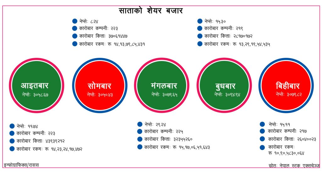 साताभर कूल २२५ कम्पनीको रु ६७ अर्ब ७४ करोड छ लाख ३९ हजार १४५ बराबरको कारोबार भयो। नेपाल स्टक एक्सचेञ्जका अनुसार साताभर कूल १६ करोड ७५ लाख ६६ हजार ११४ कित्ता शेयर कारोबार भयो। सबै दृष्टिकोणबाट हेर्दा साताभर शेयर बजारले नयाँ कीर्तिमान कायम गरेको छ।
