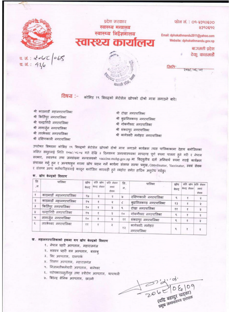 काठमाडौं – सरकारले काठमाडौंमा असोज ४ गतेदेखि ३ दिन खोप लगाउने भएको छ। स्वास्थ्य कार्यालय काठमाडौं अनुसार खोप लगाउनका लागि अनिवार्य विद्युतीय दर्ता गराउनुपर्ने छ।